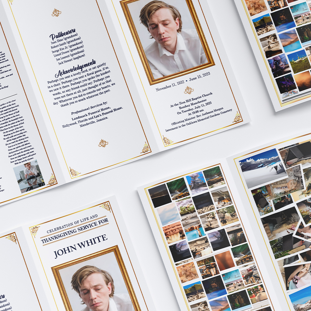 Tailored 3 Panel Trifold Memorial Program $262.50 – $669.00 Plus Tax Printed on 100# gloss text. Price includes design, photo editing & printing. *Includes up to 20 photos. More available at additional cost. Quantity Choose an option50 units100 units150 units200 units250 units300 units Size Choose an option8.5”x14”8.5”x11”11”x17”Clear Case number (optional) Add Company Logo *YesNo Service Time and Date To ensure all cards are delivered to their proper location at the proper time, it is critical that you provide us with an accurate date and time of service. We understand the nature of the prints and the importance of being on time. Selecting an inaccurate (early) date of service causes us to reschedule our deliveries. We will always have your prints ready and delivered before the service takes place.PLEASE DO NOT GIVE AN INACCURATE DATE OR TIME FOR DELIVERY. Date of Service * Time of Service * Content Information * Attach Content Information Clear forminator_submission * forminator_submission * forminator_entry_data * × Aditional Notes (optional) Tailored 3 Panel Trifold Memorial Program quantity Add to cart Related products Portrait Poster / Marquee $52.50 – $508.95 Plus Tax Select options This product has multiple variants. The options may be chosen on the product page Tailored 8 Page Booklet Memorial Program $562.50 – $1,687.50 Plus Tax Select options This product has multiple variants. The options may be chosen on the product page Elegant Frame Prayer Card $52.50 – $502.50 Plus Tax Customize This product has multiple variants. The options may be chosen on the product page Upload Your Own Prayer Card $52.50 – $502.50 Plus Tax Customize This product has multiple variants. The options may be chosen on the product page Tailored 4 Page Bifold Memorial Program $262.50 – $600.00 Plus Tax Select options This product has multiple variants. The options may be chosen on the product page